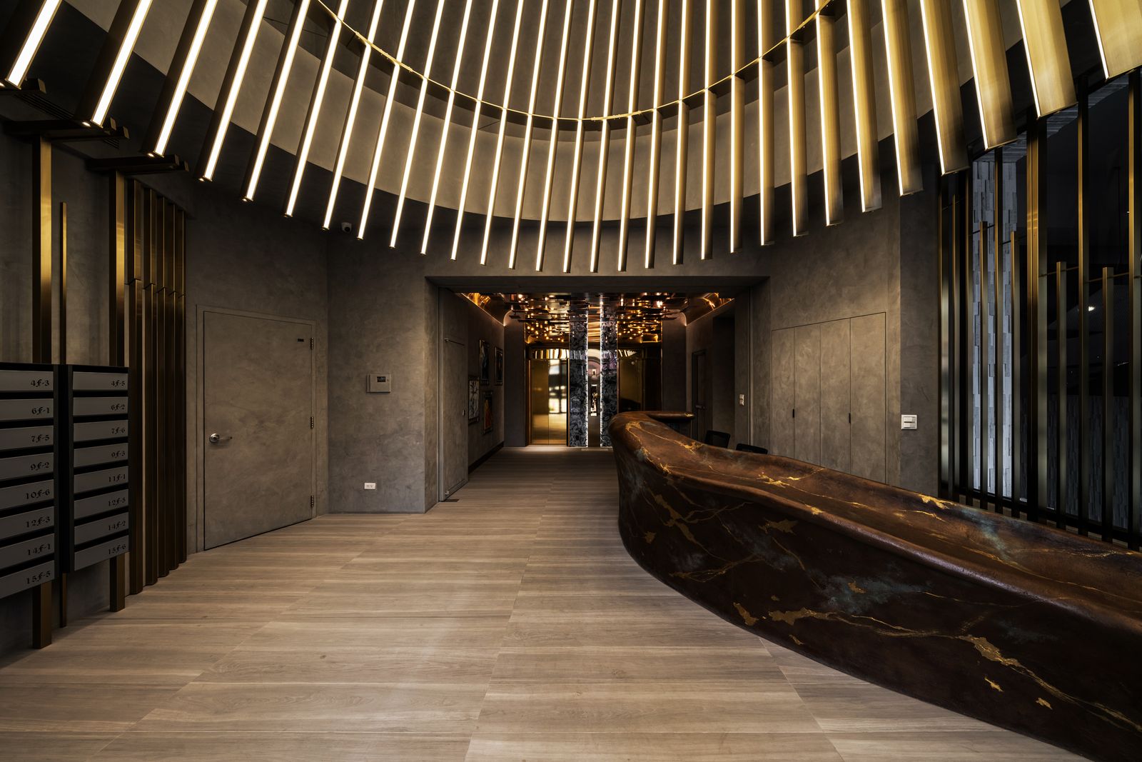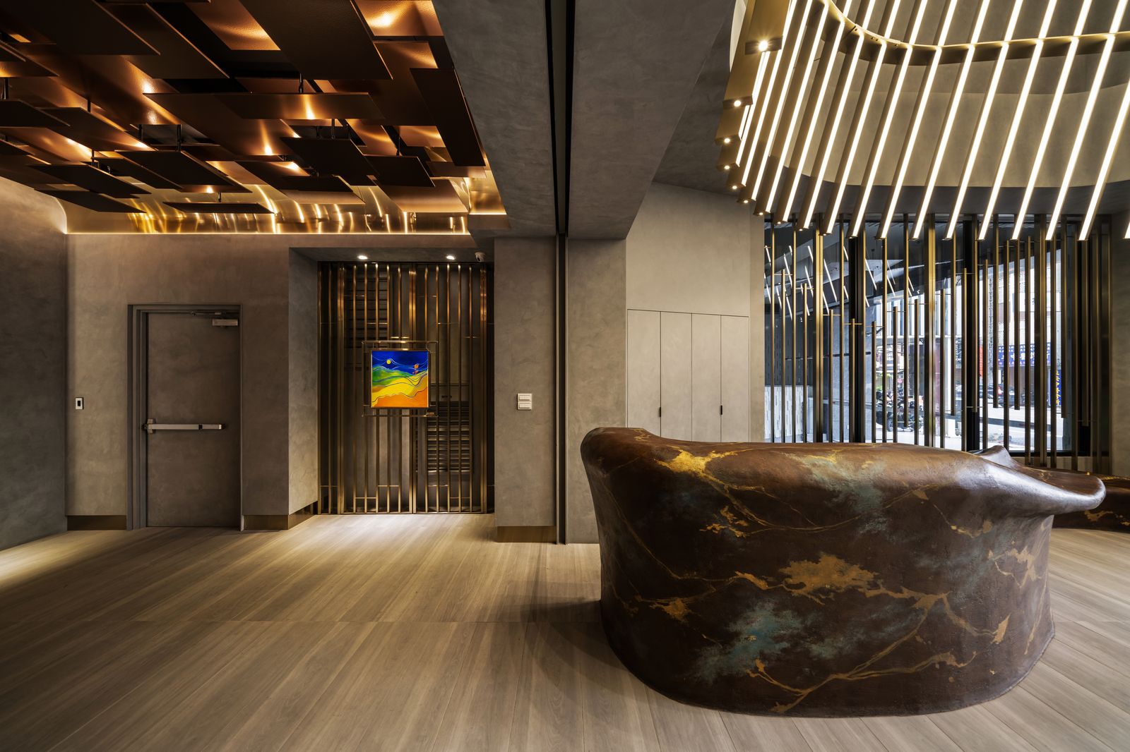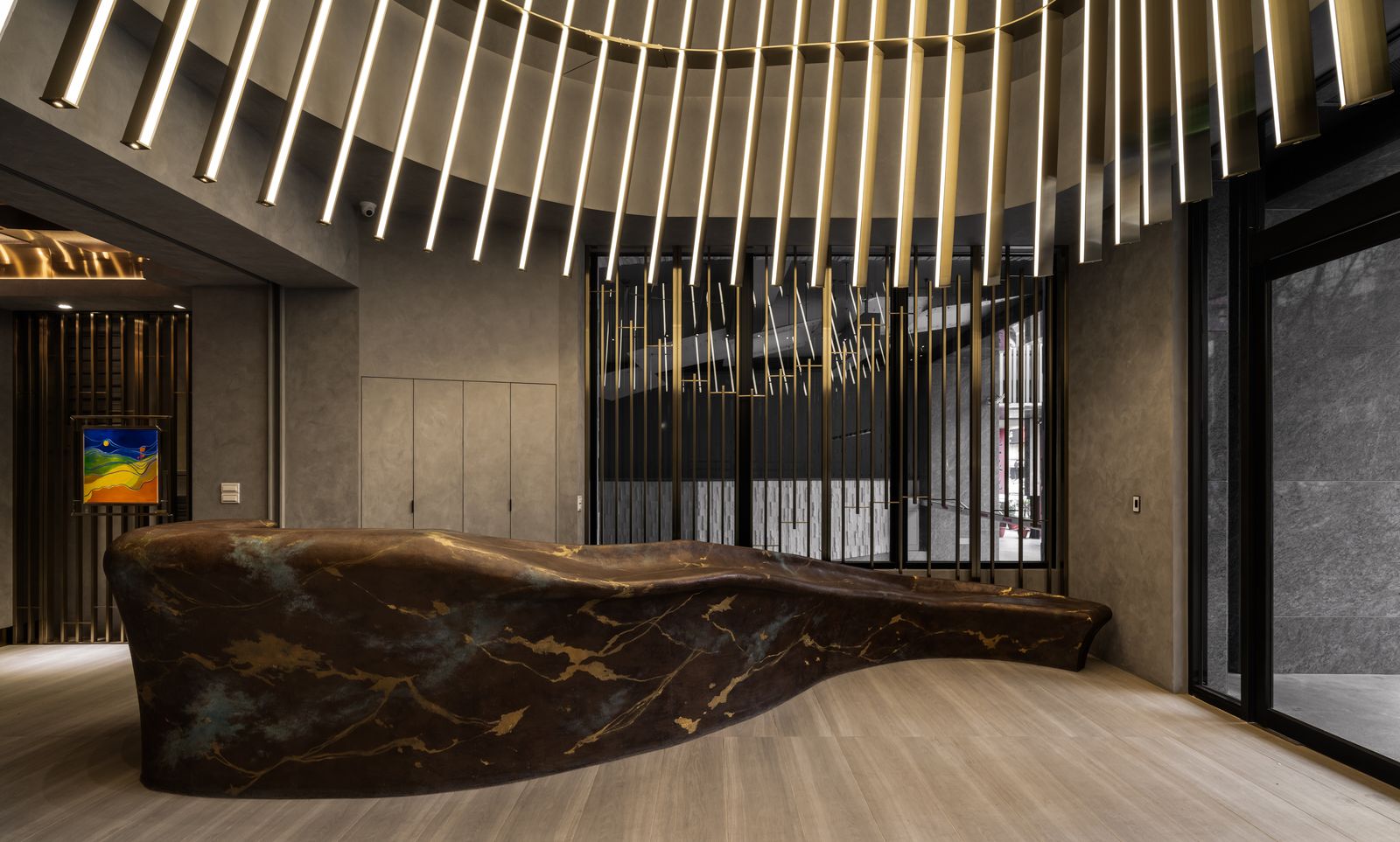 變換的不可知,是令人徬徨的,然而轉變若能成為更好,則是值得期待的。 我們期待一個好的環境,能引導人經由所接觸的物件,成為更美好的自己。 視覺的光,是人感官最直接的元素,條狀的金色成為實質的象徵與形狀, 在高聳的入口,以無限延伸的姿態,引導人的視線向上發展。 當再次回到地面的時刻,呈現的原始孕育,斑斕燦爛的靛藍、 土黃的胚胎原形,係累積能量的開始, 至端部我們期待鳳凰得以在此長成。(因在台南,我們所在的是神鳥之地。) 坐在椅子上的人應值得擁有成為鳳凰的期待。 大堂的最深處,有兩片深海藍彩條,仔細一看,那是原始生命的型態。 這個場域是由象徵金、木、水所構成的氣場, 希望在此停留或經過的人經由此處,讓自己更美好, 來面對出門後的外在與享受回家的自在。