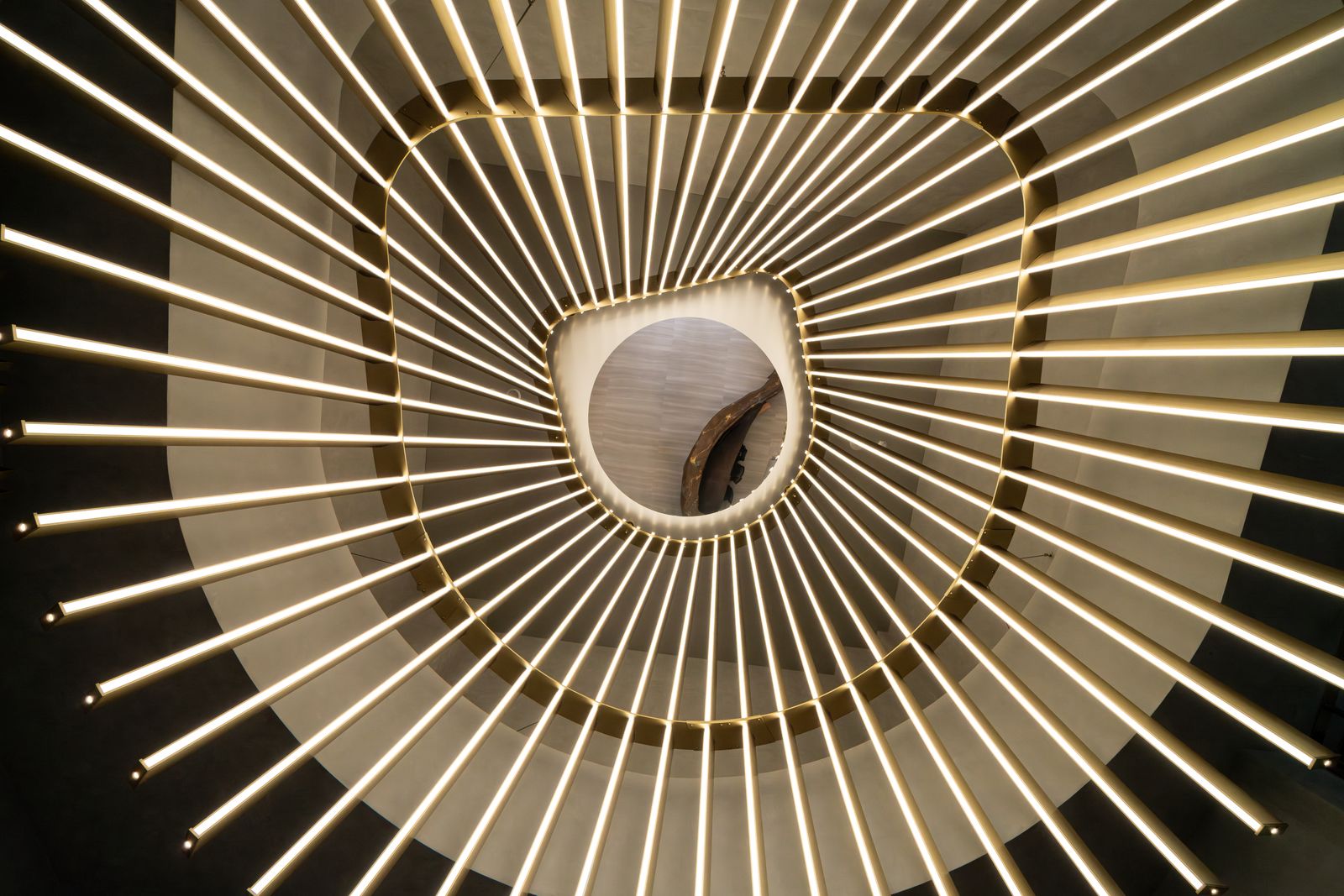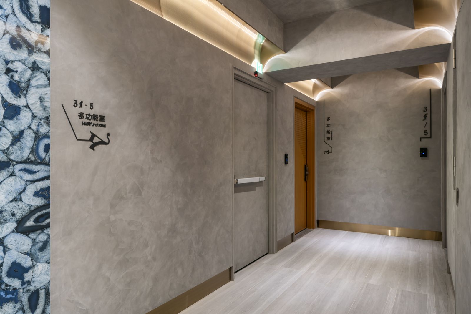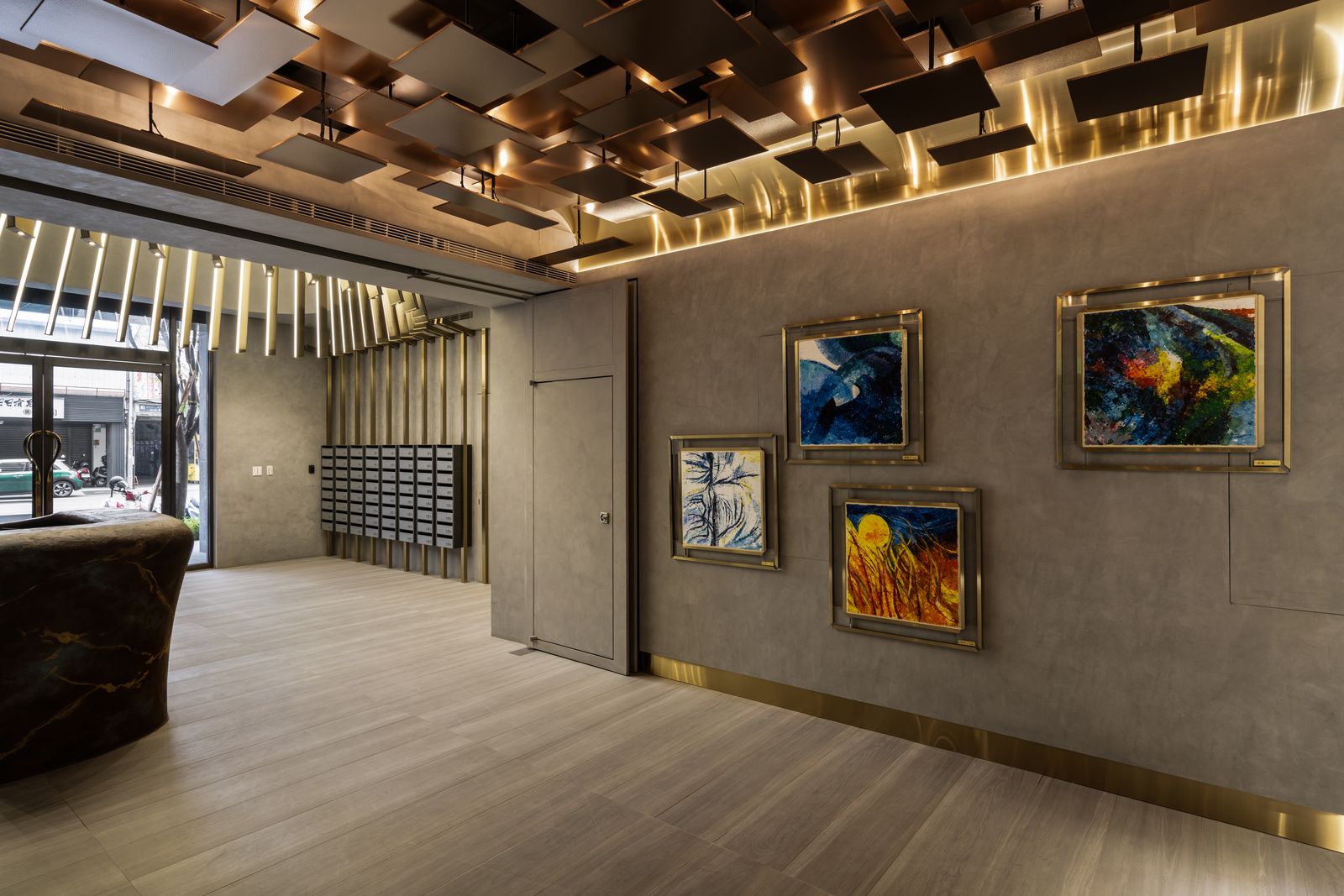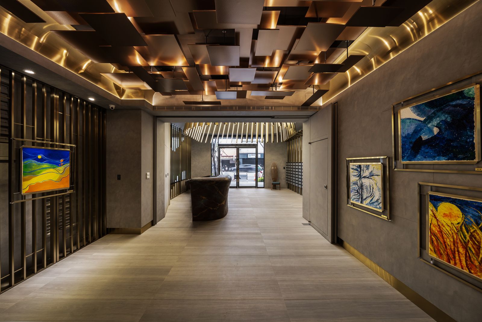 變換的不可知,是令人徬徨的,然而轉變若能成為更好,則是值得期待的。 我們期待一個好的環境,能引導人經由所接觸的物件,成為更美好的自己。 視覺的光,是人感官最直接的元素,條狀的金色成為實質的象徵與形狀, 在高聳的入口,以無限延伸的姿態,引導人的視線向上發展。 當再次回到地面的時刻,呈現的原始孕育,斑斕燦爛的靛藍、 土黃的胚胎原形,係累積能量的開始, 至端部我們期待鳳凰得以在此長成。(因在台南,我們所在的是神鳥之地。) 坐在椅子上的人應值得擁有成為鳳凰的期待。 大堂的最深處,有兩片深海藍彩條,仔細一看,那是原始生命的型態。 這個場域是由象徵金、木、水所構成的氣場, 希望在此停留或經過的人經由此處,讓自己更美好, 來面對出門後的外在與享受回家的自在。